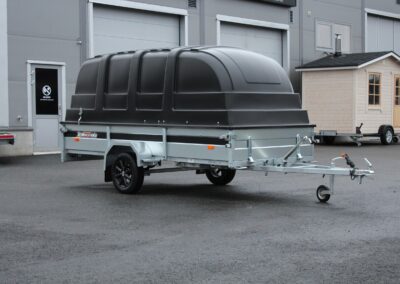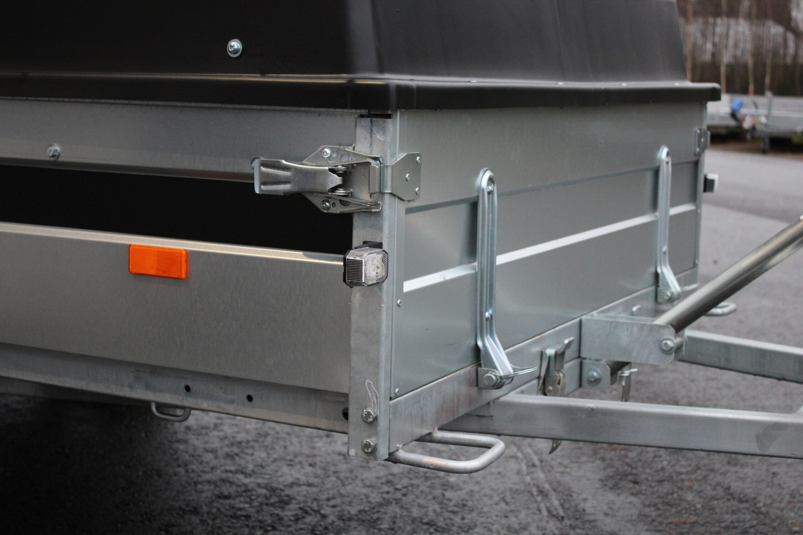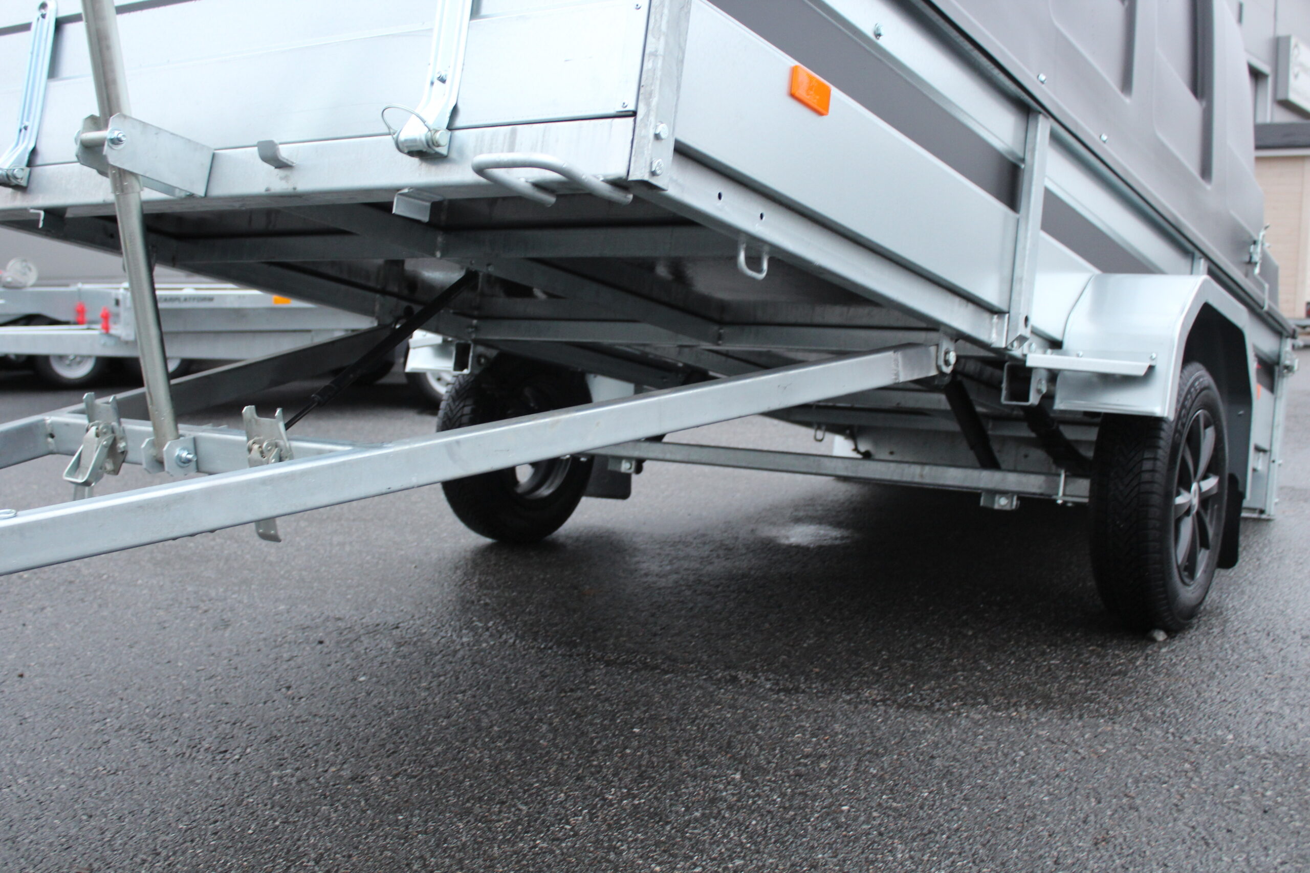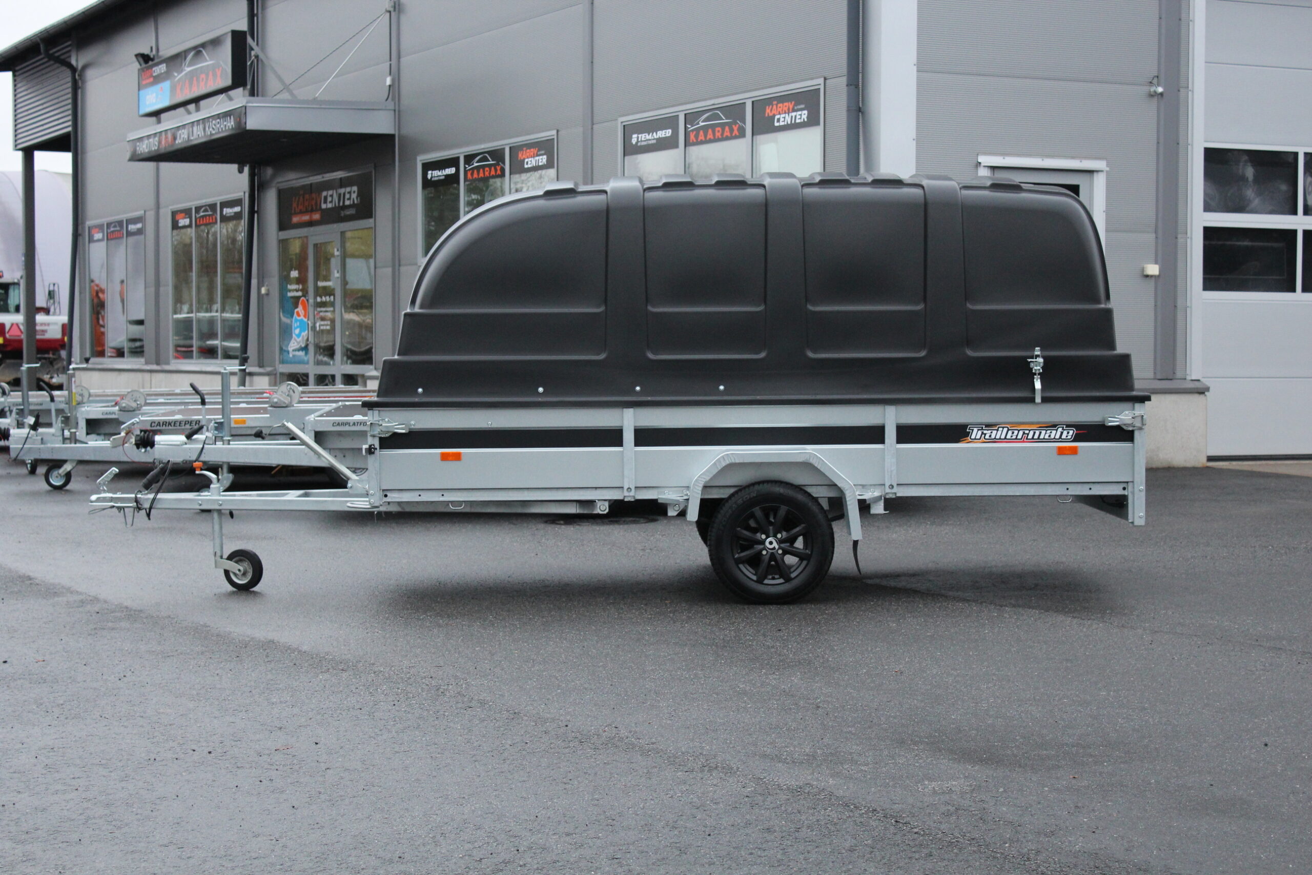 Kevyttä kuomullista peräkärryä harkitsevan kannattaa kiinnittää huomio Trailermateen, joka simppelistä ensivaikutelmasta huolimatta on täynnä kilpailijoista edukseen erottuvia ominaisuuksia. Eikä tämä ole myyjän paskapuhetta. Lehtijouset ja iskunvaimentimet varmistavat erinomaisen kantavuuden ja ajomukavuuden. 750 kg:n navat isolla kestävällä laakerilla. Renkaat 155R13 M + S. Etu- että takalaidat ovat vahvistettu vesivanerilla. Saranoidun etulaidan saa auki myös kuomun ollessa päällä! Pohjassa on 8 kpl kuormankiinnityssilmukkaa ja ulkopuolella 6 kpl hitsattua silmukkaa. Monipuolisen kärryn takalaita toimii lastaus apuna. Trailermate on saatavilla mustalla tai harmaalla Jaxal-kuomulla. Kuvien alumiinivanteet saatavilla lisävarusteena.