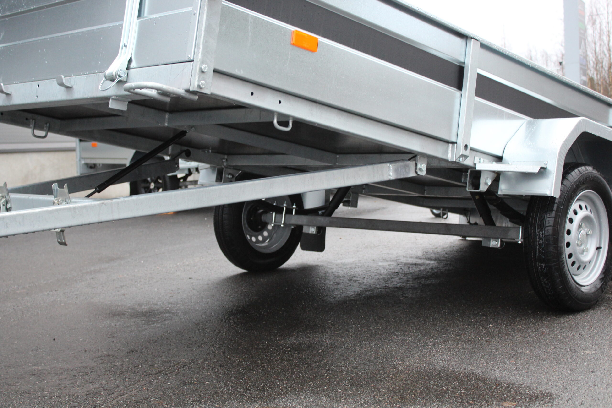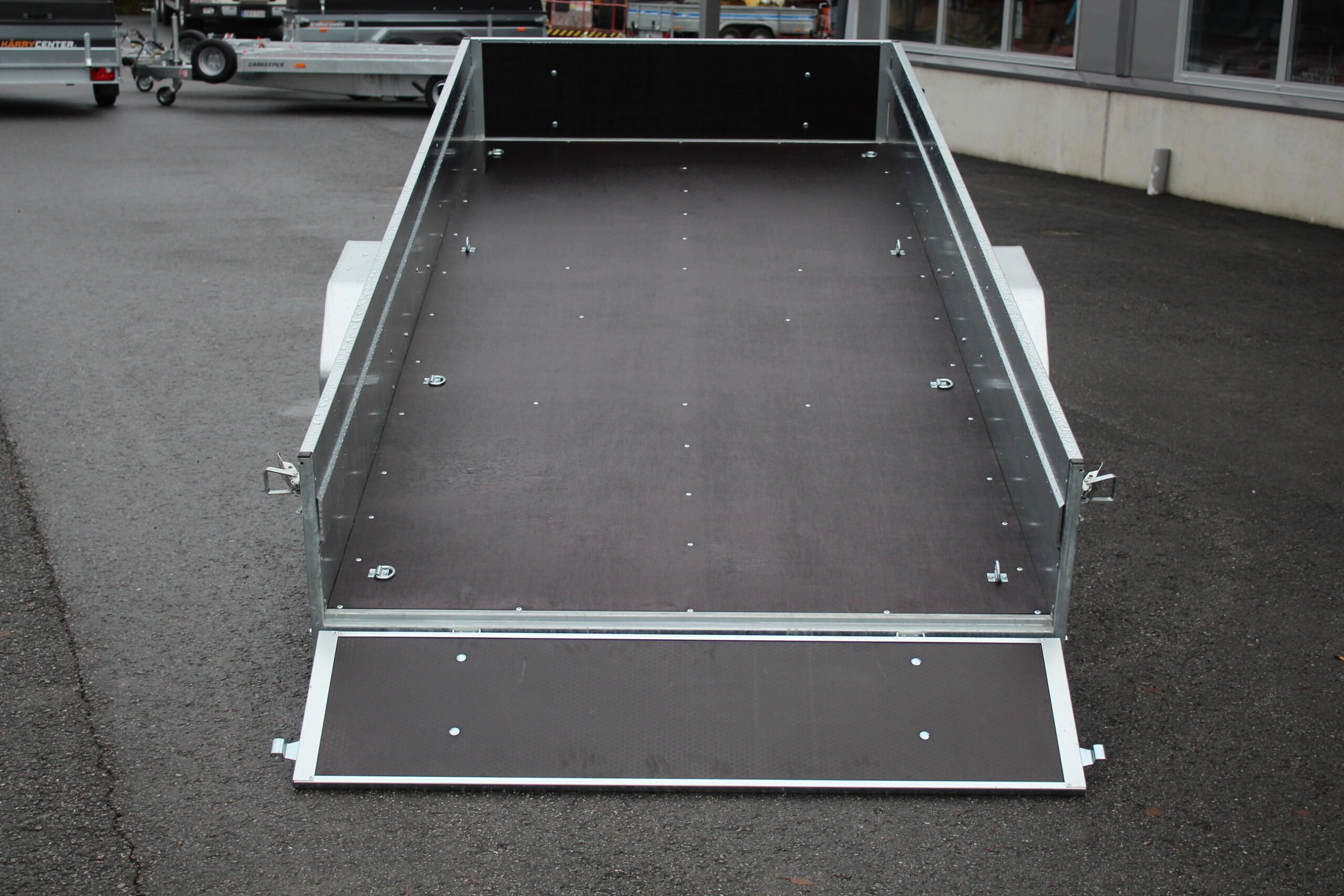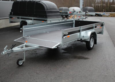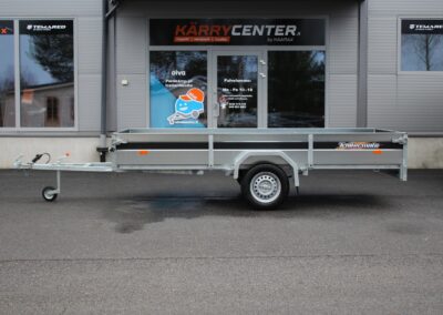 Jos tarvitset tavallisen, mutta laadukkaan jarruttoman peräkärryn niin se on tässä! Lehtijouset ja iskunvaimentimet varmistavat erinomaisen kantavuuden ja ajomukavuuden. 750 kg:n navat isolla kestävällä laakerilla. Renkaat ovat vakiona 155 R13 M + S. Etu- että takalaidat ovat vahvistettu vesivanerilla. Pohjassa on 8 kpl kuormankiinnityssilmukkaa ja ulkopuolella 6 kpl hitsattua silmukkaa. Monipuolisen kärryn takalaita toimii lastaus apuna. Kuvien R14 kitkarenkaat saatavilla lisävarusteena. Monipuolisen kärryn takalaita toimii lastaus apuna.