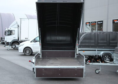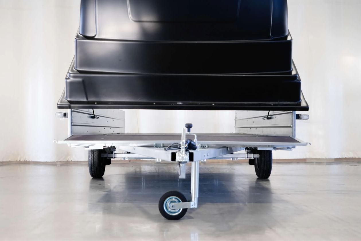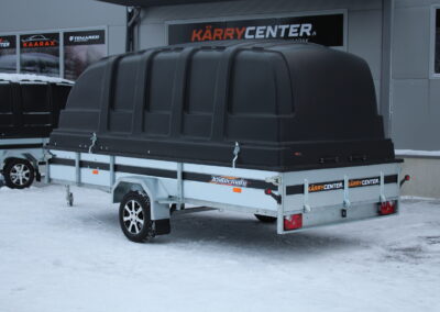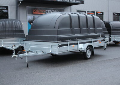 Kevyttä kuomullista peräkärryä harkitsevan kannattaa kiinnittää huomio Trailermateen, joka simppelistä ensivaikutelmasta huolimatta on täynnä kilpailijoista edukseen erottuvia ominaisuuksia. Sisältää: Kippiruuvin, Kuomun vahvistetun saranasarjan: 2x tuulihaat, kaasujousitoimiset (vahvemmat) saranat. Valitse väriksesi Jaxal-kuomuista musta tai harmaa. Eikä tämä ole myyjän paskapuhetta. Lehtijouset ja iskunvaimentimet varmistavat erinomaisen kantavuuden ja ajomukavuuden. 750 kg:n navat isolla kestävällä laakerilla. Renkaat ovat 155 R13 M + S. Etu- että takalaidat ovat vahvistettu vesivanerilla. Pohjassa on 8 kpl kuormankiinnityssilmukkaa ja ulkopuolella 6 kpl hitsattua silmukkaa. Monipuolisen kärryn takalaita toimii lastaus apuna. Kaikissa kuomumalleissa on vakiovarusteena teräksestä valmistettu kehikko, joka kuomun alareunaan asennettuna jäykistää kuomun rakenteen. Kuomu sisältää vahvistetun saranasarjan: 2x tuulihaat, kaasujousitoimiset (vahvemmat) saranat. Saatavilla myös ilman kuomua.