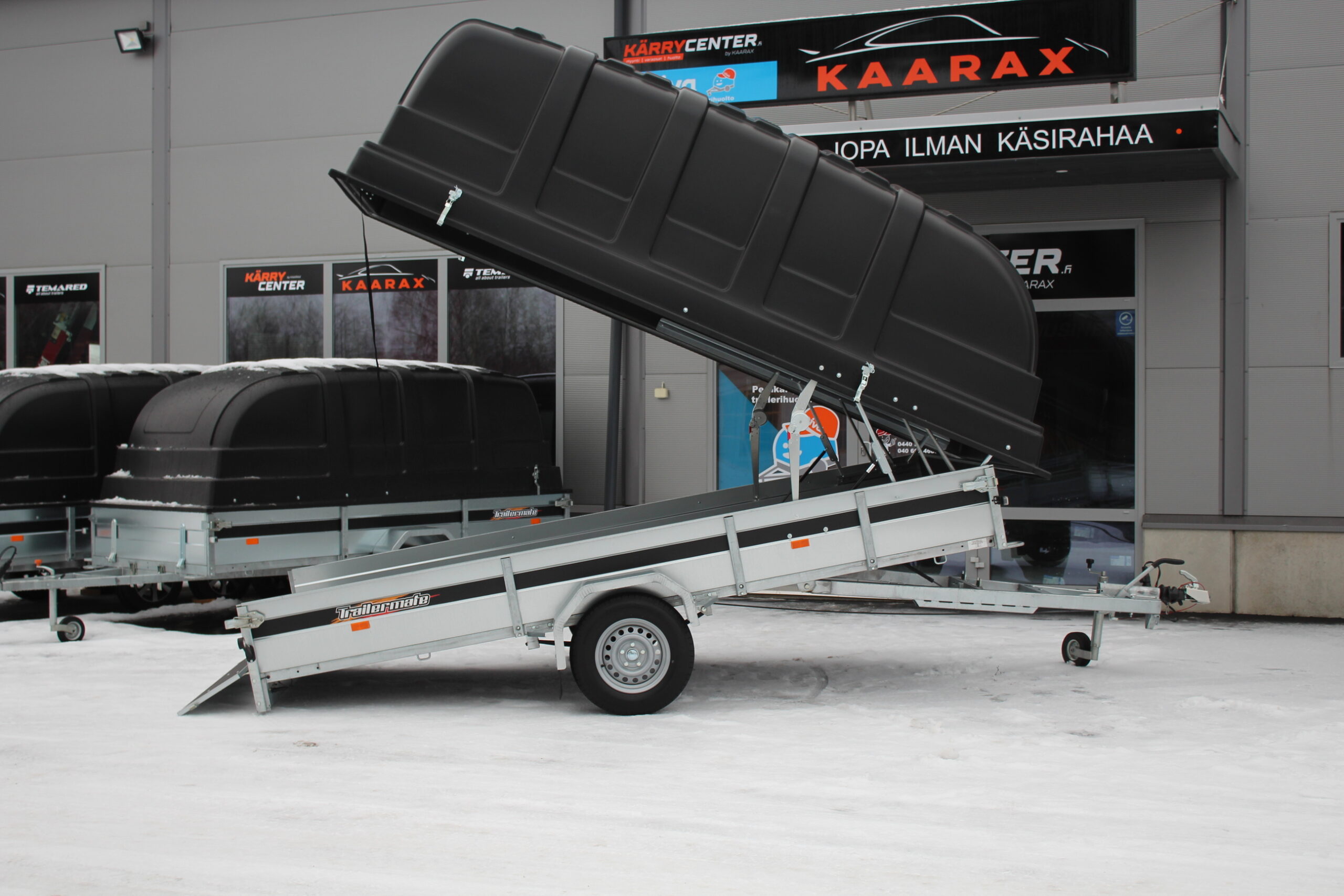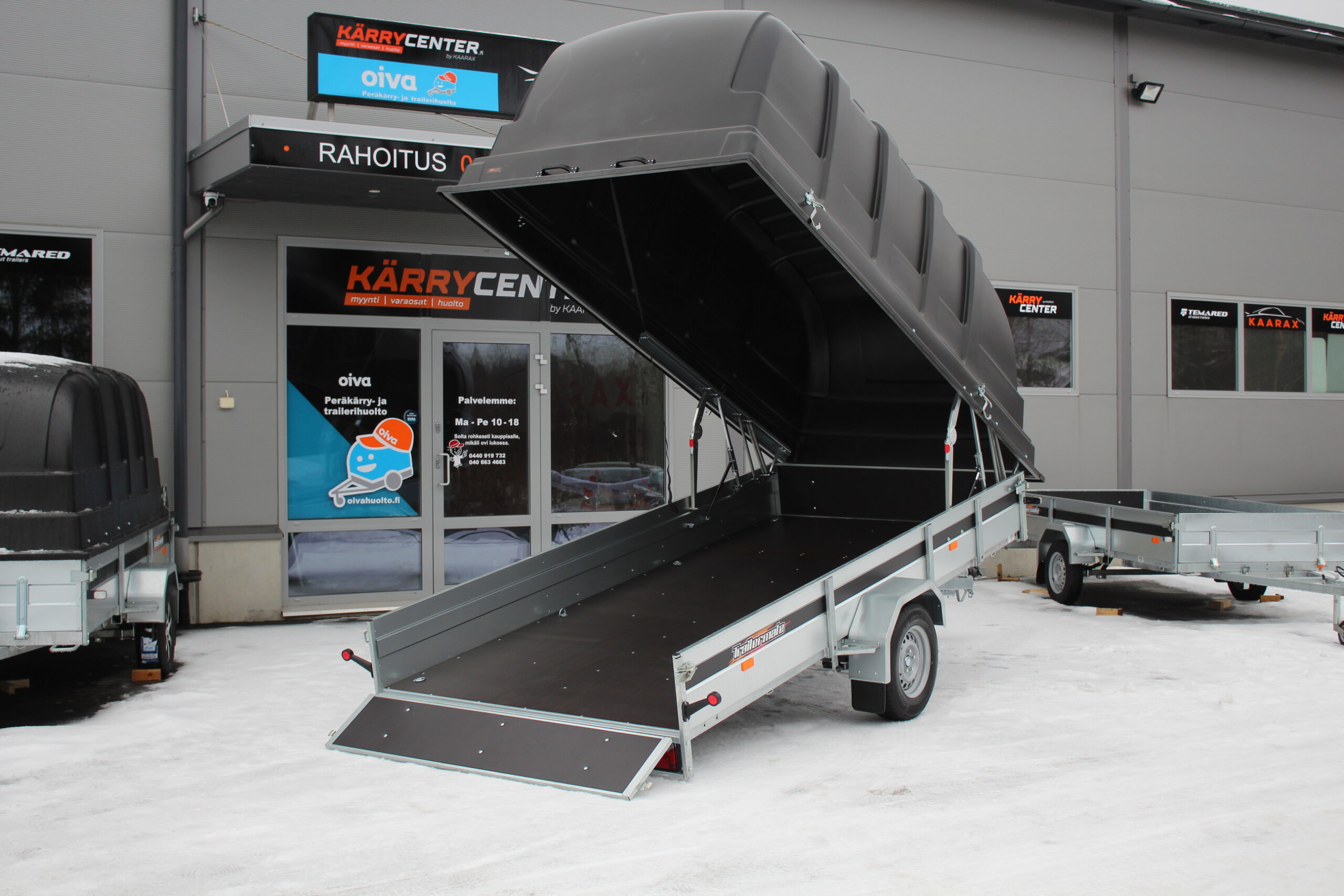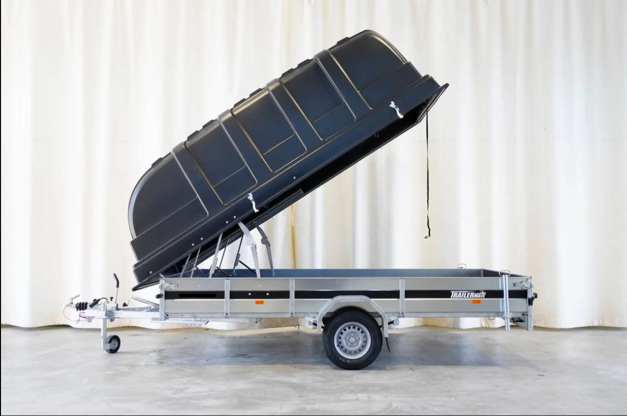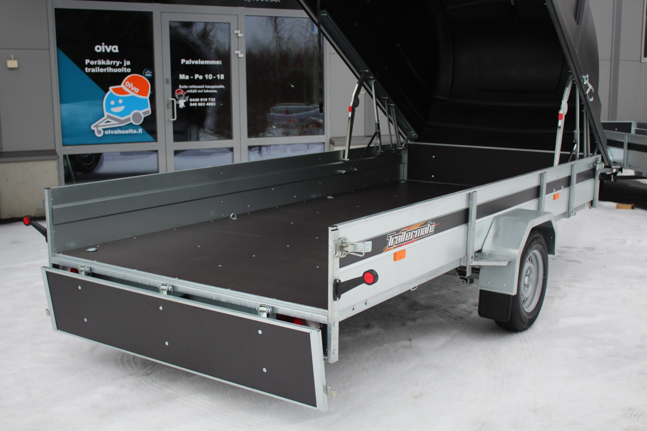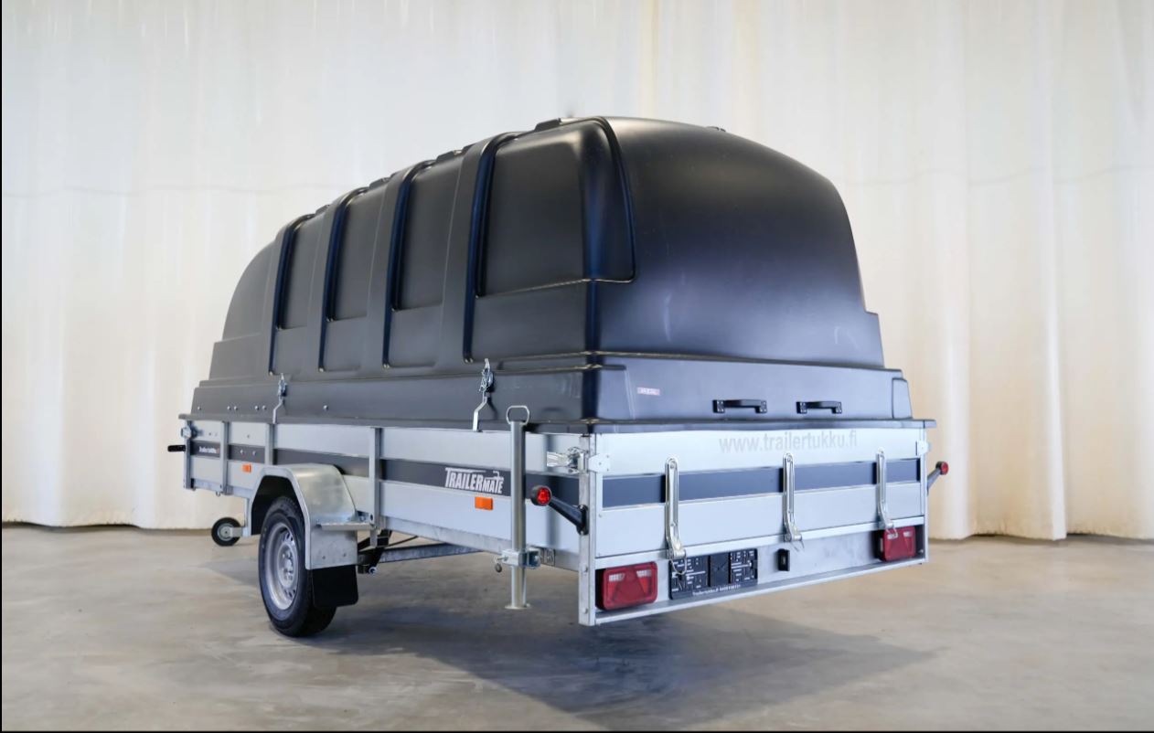 Tarjoustuote sisältää kippiruuvin. Järeämpää kuomullista peräkärryä harkitsevan kannattaa kiinnittää huomio tähän jarrulliseen Trailermateen, joka simppelistä ensivaikutelmasta huolimatta on täynnä kilpailijoista edukseen erottuvia ominaisuuksia. Eikä tämä ole myyjän paskapuhetta. Lehtijouset ja iskunvaimentimet varmistavat erinomaisen kantavuuden ja ajomukavuuden. Etu- että takalaidat ovat vahvistettu vesivanerilla. Pohjassa on 8 kpl kuormankiinnityssilmukkaa ja ulkopuolella 6 kpl hitsattua silmukkaa. Monipuolisen kärryn takalaita toimii lastaus apuna. Valitse väriksesi Jaxal-kuomuista musta tai harmaa. Kuomu sisältää vahvistetun saranasarjan: 2x tuulihaat, kaasujousitoimiset (vahvemmat) saranat. Kuvien tukijalat ja ovat saatavilla lisävarusteena.