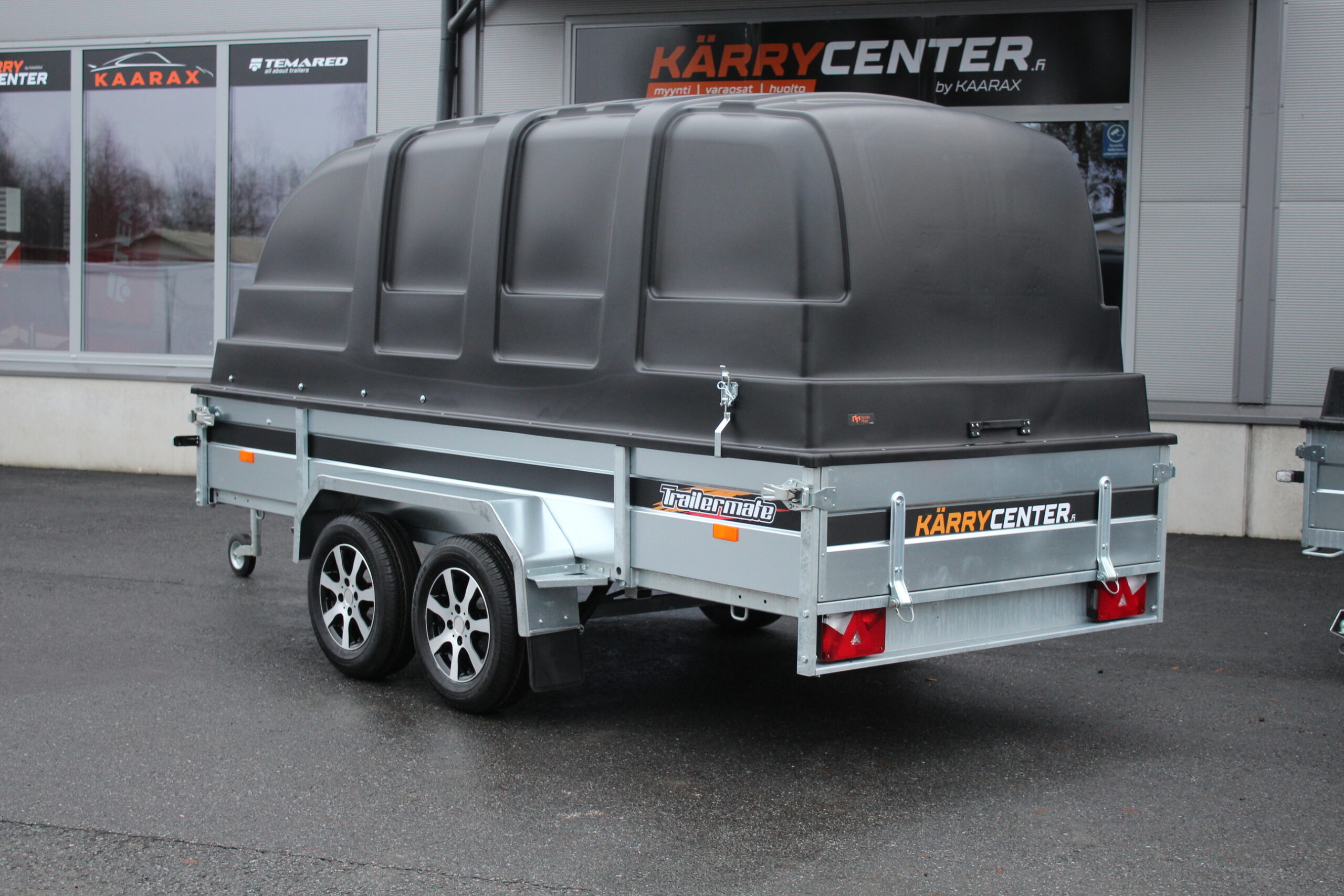 Peräkärryn kuomu mustana tai harmaana läpivärjättyä muovia